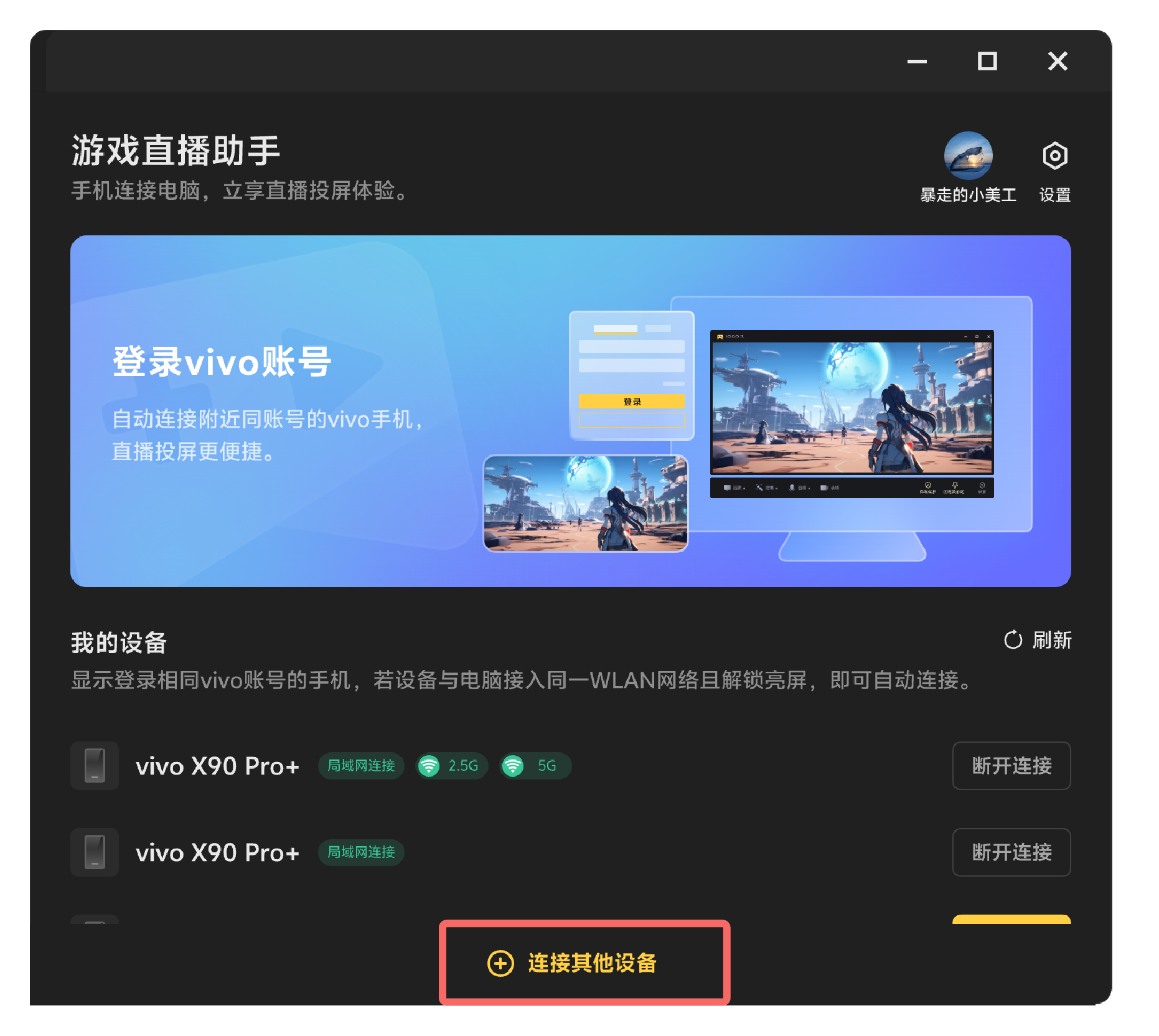游戏 + 主播出镜:一台设备投屏游戏画面,另一台作为摄像头,也可使用前置摄像头进行美颜预览并作为主播画中画窗口,让直播更有互动感