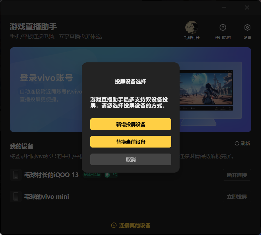 注意:选择【替换当前设备】将用新设备替换现有投屏。