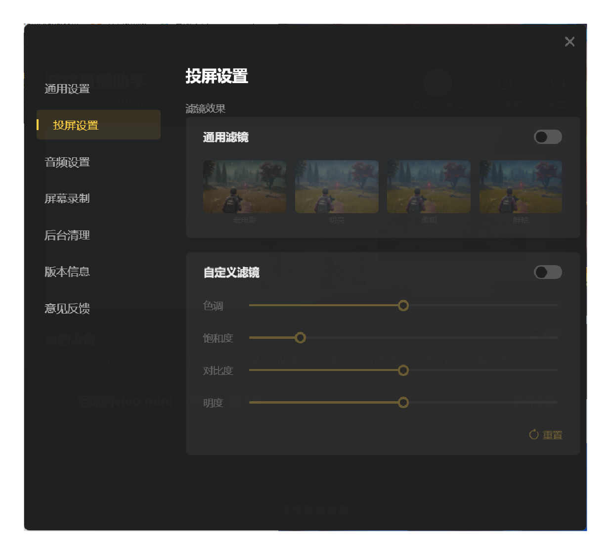 1)打开电脑端游戏直播助手 → 设置 →【投屏设置】进入滤镜效果设置页面。