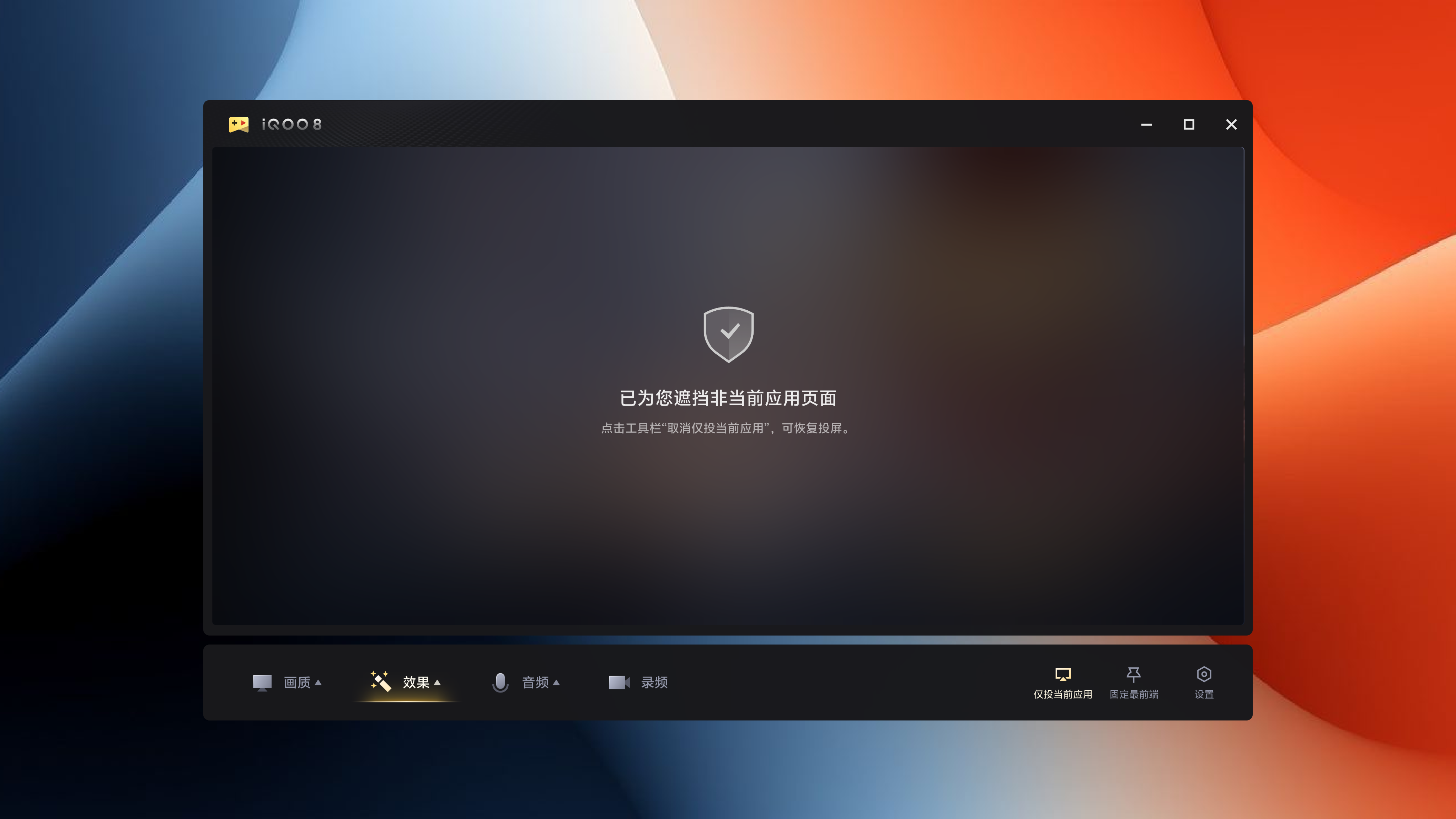 2)若退出该应用,投屏窗口会使用预置蒙版自动遮盖当前投屏画面,并提示:“已为您遮挡非当前应用画面。再次点击工具栏‘仅投当前应用’可恢复投屏。”