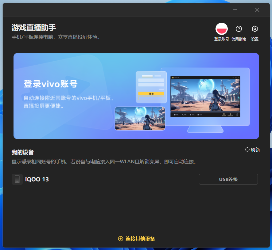(2)打开电脑的游戏直播助手,登录账号的情况下,点击“连接其他设备”,显示二维码。